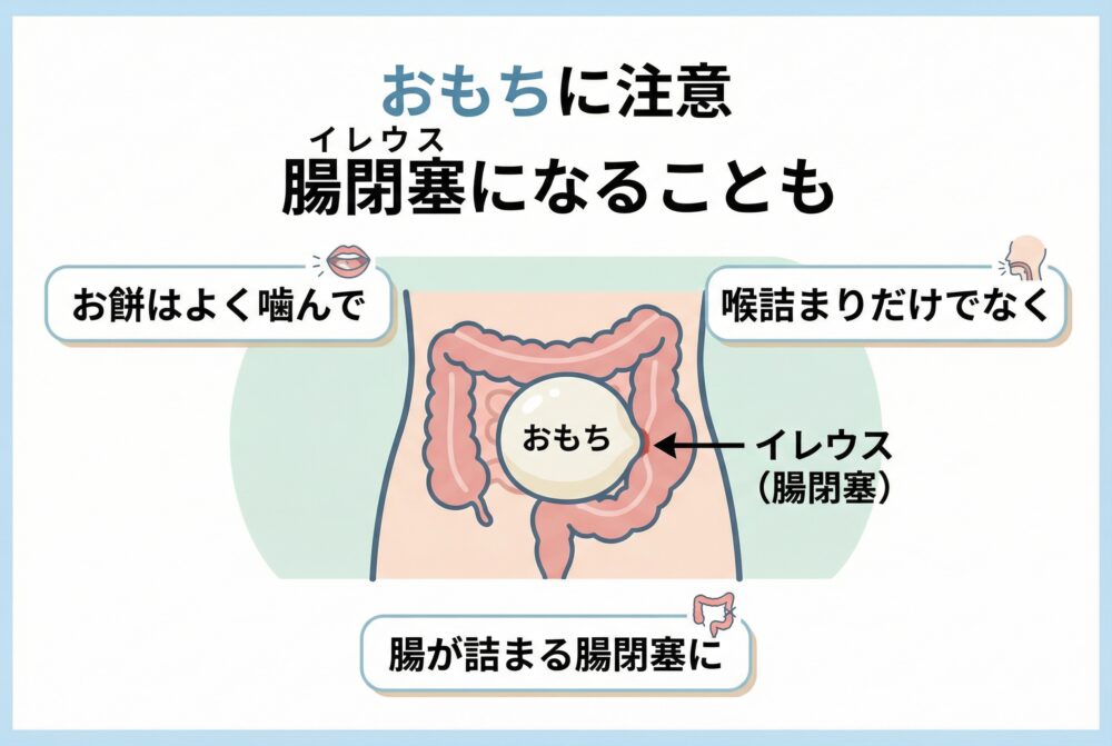 おもちによる腸閉塞は、消化されにくいおもちが原因で起こります。特に年末年始は要注意。高齢者、歯が弱い、早食い、腹部手術歴のある方はリスクが高いです。